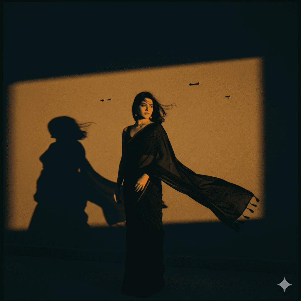 “Convert this person into a retro vintage grainy but bright image, black party-wear saree, 90s film aesthetic. She is standing against a solid, deep wall with dramatic shadows and contrast, creating a mysterious and artistic atmosphere. The environment feels windy and romanticized. Lighting is warm, with golden sunset tones evoking a golden hour glow. The background is minimalist and slightly textured. Her expression is moody, calm, yet subtly happy and introspective.”