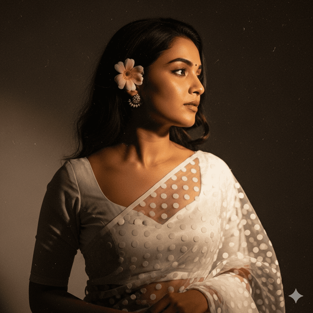 “Create a 4K HD realistic portrait of a woman in a translucent white polka dot saree with a blouse. Preserve her facial features and smile. Add a small pink flower tucked behind her ear and a soft, serene expression. Lighting comes from the right side, casting a cinematic profile shadow. Pure vintage diva energy.”